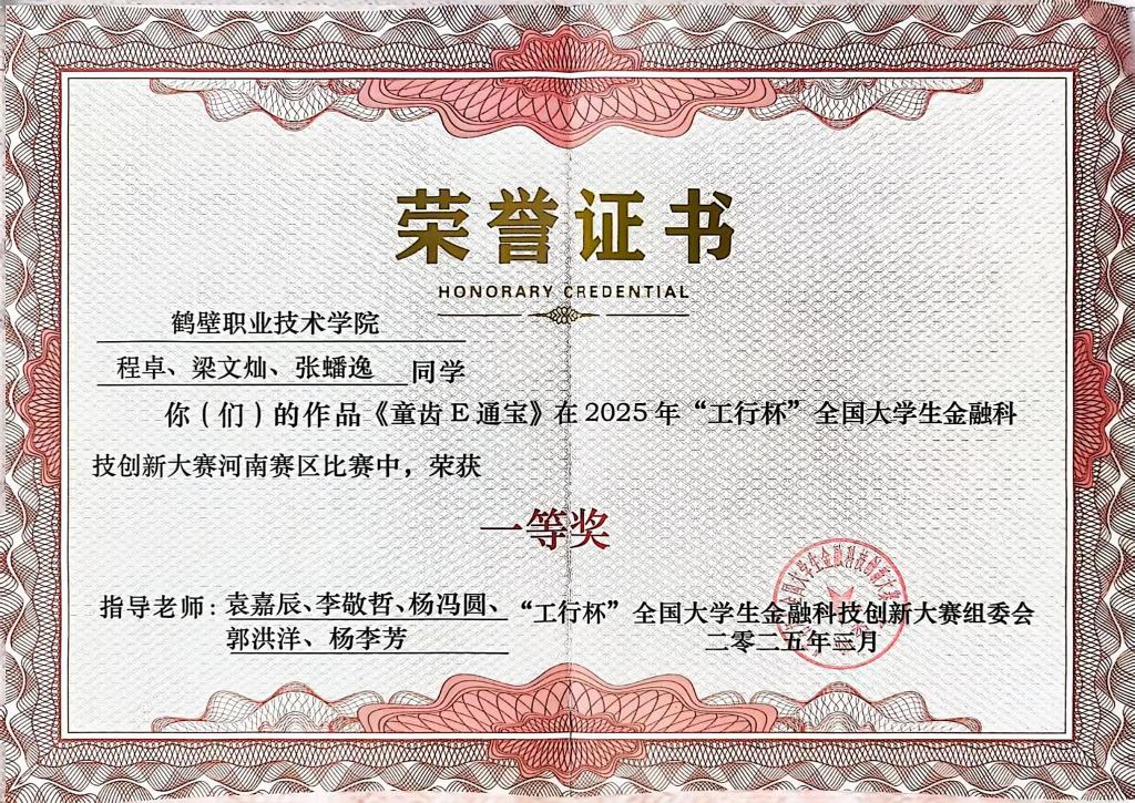 《童齿E通宝》项目在2025年“工行杯”全国大学生金融科技创新大赛河南赛区比赛中,荣获一等奖。
